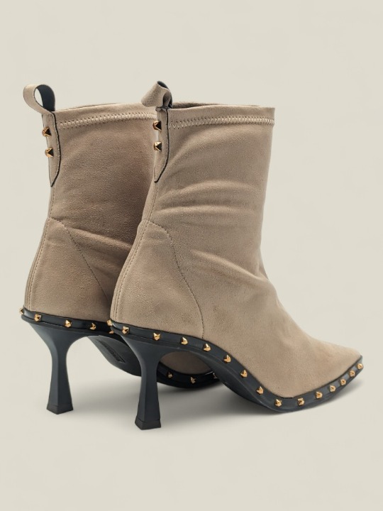 Botines de tejido elástico efecto ante, o napa  en el color negro. Los botines TOKIO son un clásico imprescindible en cualquier armario. Un diseño que combina estilo y versatilidad, brindando una opción elegante y atemporal para diversas ocasiones. Su tejido elástico ofrece un ajuste óptimo y mayor comodidad de movimiento al caminar. El detalle de las tachas marca la diferencia del modelo.