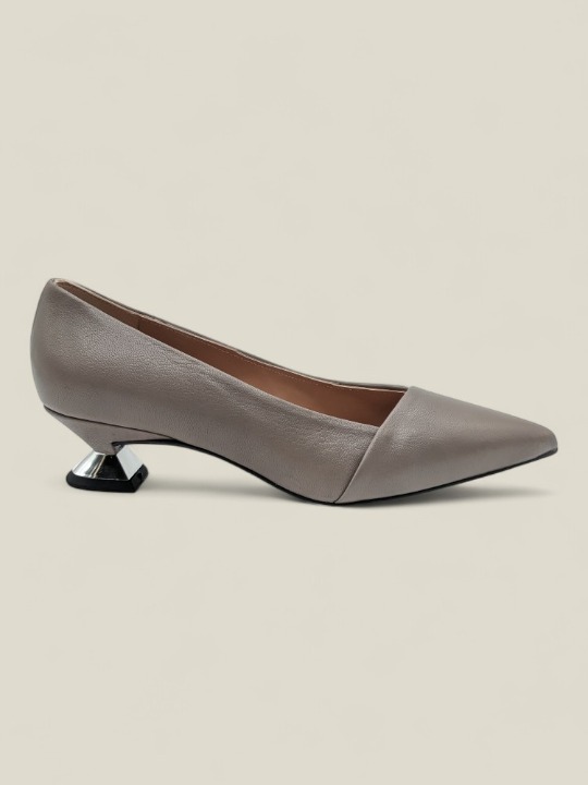 su tacón geométrico de acabado metálico añade un toque moderno y único.
