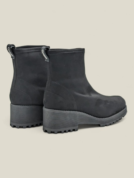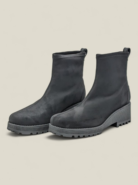 Písale fuerte al estilo esta temporada con nuestros botines de tejido elástico de caña media. Confeccionados en un suede sintético de tacto suave, son la combinación perfecta de tendencia y comodidad. La suela track o dentada, con una ligera plataforma, no solo añade altura y carácter, sino que también ofrece un agarre superior. El diseño tipo calcetín garantiza un ajuste ceñido y fácil de calzar. Ideales para un look urbano e invernal con personalidad.