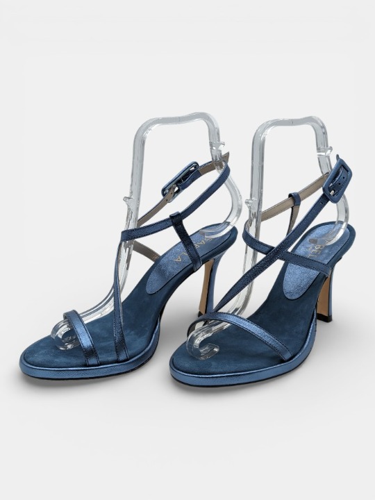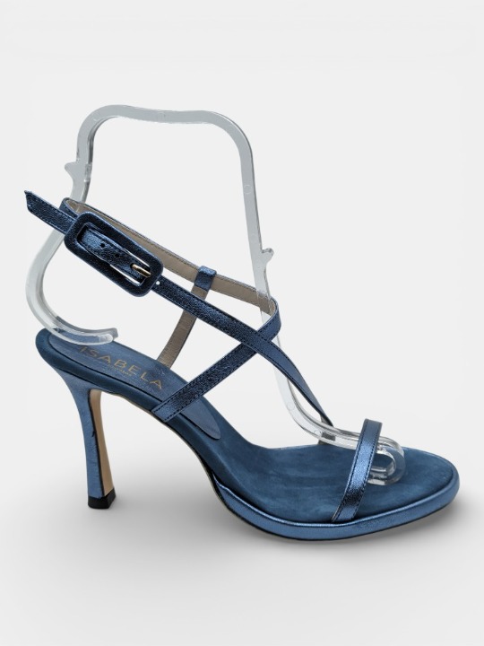 Sensualidad en Tiras Finas La sofisticación se vuelve ligera con este modelo en tonos metalizados. A diferencia de los diseños de bloque, estas sandalias apuestan por un tacón de aguja estilizado que alarga la pierna visualmente, ideal para eventos de etiqueta. Su plataforma es mínima y discreta, casi imperceptible, integrada perfectamente en la suela para mantener una silueta limpia y elegante. Es el calzado perfecto para vestidos vaporosos y looks de noche refinados.