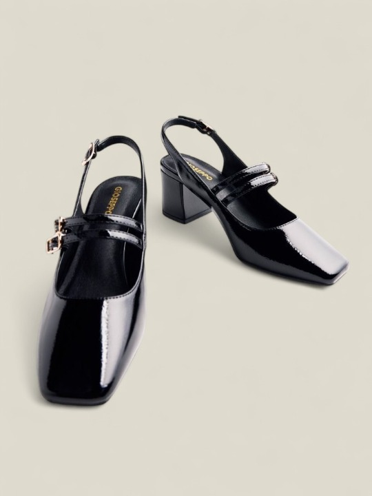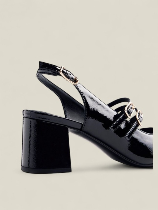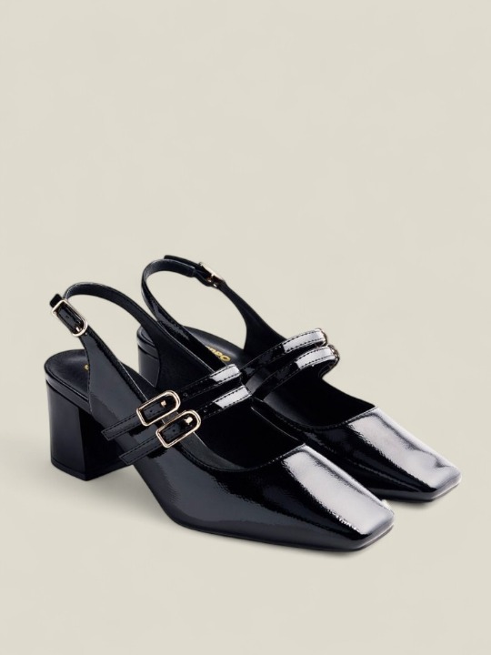 Zapatos estilo Mary-Jane destalonados con acabado en efecto charol. Punta cuadrada. Cuentan con planta acolchada, tacón tipo bloque y cierres ajustables en el empeine y en el talón. Altura tacón: 5,5 cm.