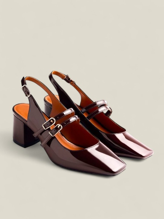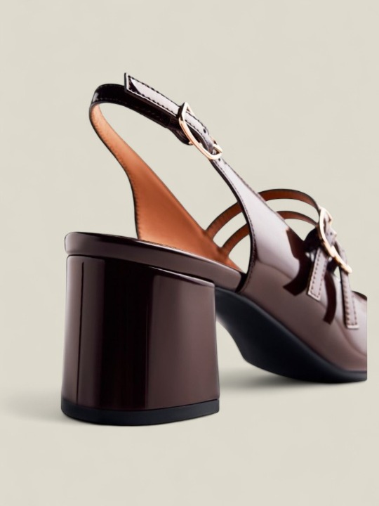 Zapatos estilo Mary-Jane destalonados con acabado en efecto charol. Punta cuadrada. Cuentan con planta acolchada, tacón tipo bloque y cierres ajustables en el empeine y en el talón. Altura tacón: 5,5 cm.
