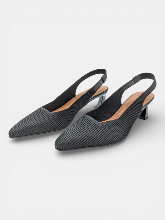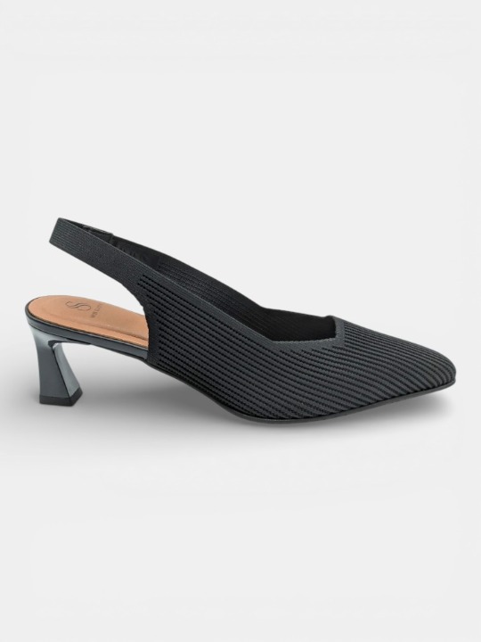 Zapato tipo salón destalonado fabricado en tejido técnico elástico de alta resistencia. Su estructura flexible permite un calce inmediato y cómodo, adaptándose incluso a pies delicados. Presenta una puntera suavemente perfilada y un tacón de bloque estilizado que garantiza equilibrio y confort.