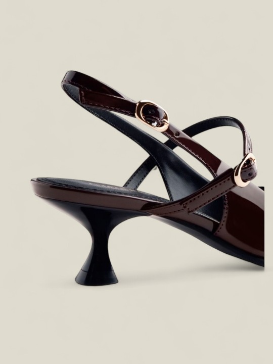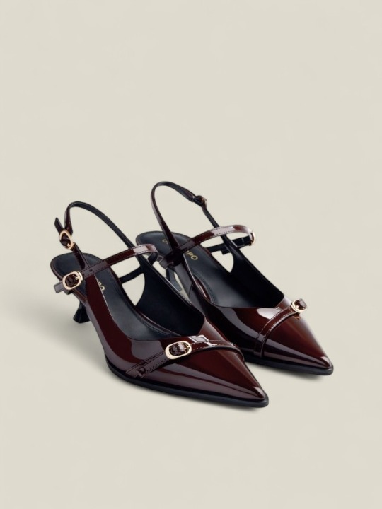 Zapatos de tacón tipo salones destalonados con acabado en efecto charol y detalle de hebillas. Punta afilada. Cuentan con tacón bajo tipo carrete, cierres ajustables y planta acolchada. Altura tacón: 4 cm.