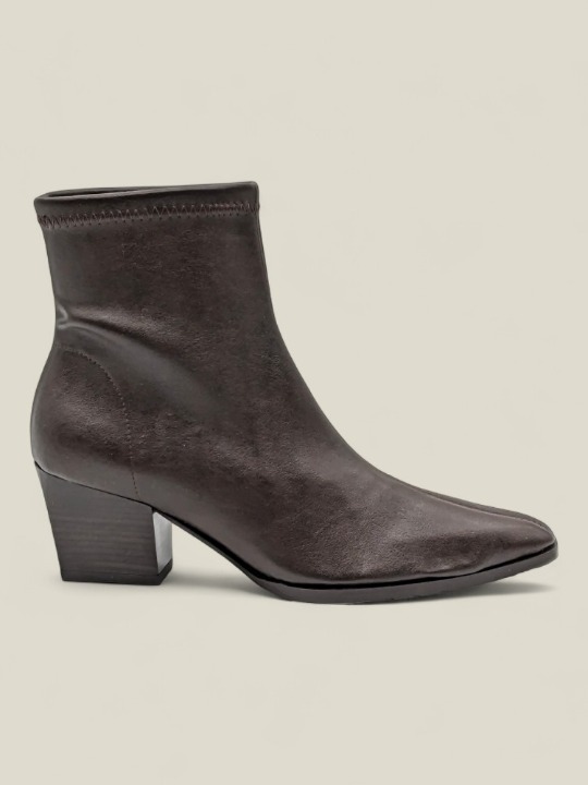 ZAP. MISS ELASTICDescubre el equilibrio perfecto entre moda y comodidad con nuestro botín de caña elástica. Fabricado en napa elastica de alta calidad en un sofisticado tono marrón oscuro (o "marrón chocolate"), este diseño abraza tu tobillo para un ajuste impecable. La puntera sutilmente afilada y el tacón de bloque de altura media ofrecen una silueta moderna y estable, ideal para llevar de la mañana a la noche. Un básico elegante que no puede faltar en tu armario de temporada