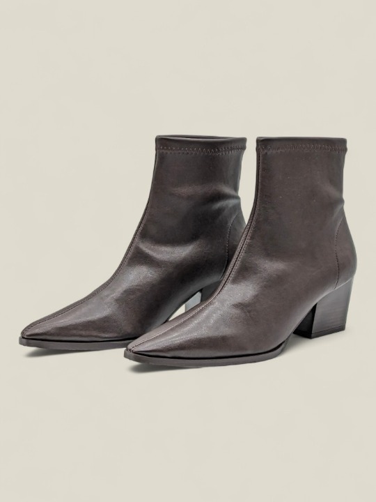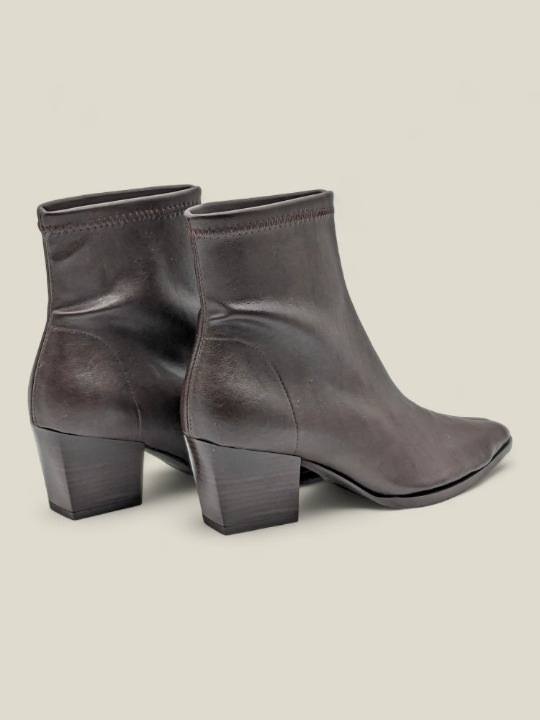 ZAP. MISS ELASTICDescubre el equilibrio perfecto entre moda y comodidad con nuestro botín de caña elástica. Fabricado en napa elastica de alta calidad en un sofisticado tono marrón oscuro (o "marrón chocolate"), este diseño abraza tu tobillo para un ajuste impecable. La puntera sutilmente afilada y el tacón de bloque de altura media ofrecen una silueta moderna y estable, ideal para llevar de la mañana a la noche. Un básico elegante que no puede faltar en tu armario de temporada