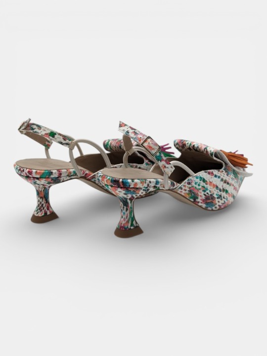 serpiente y divertidas borlas en verde, fucsia y mostaza, estos zapatos son la