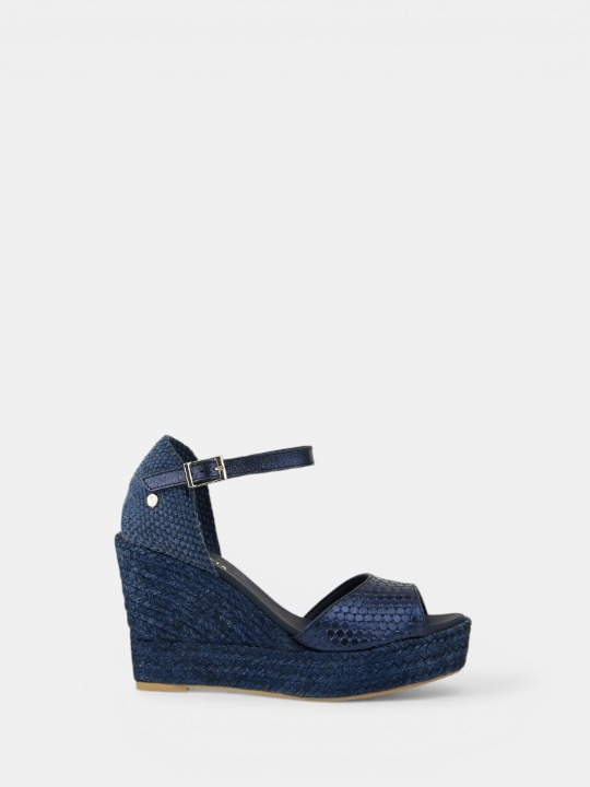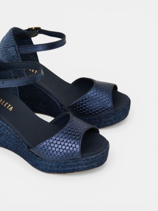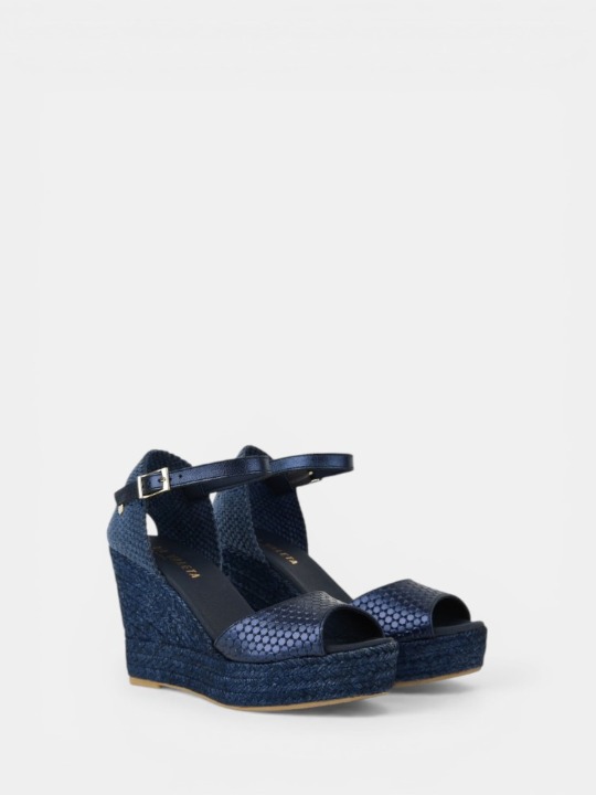 VERA PEEP TOE son unas cuñas con un diseño moderno y versátil, perfectas para cualquier ocasión. Fabricadas en napa metalizada con grabado de motivos hexagonales, combinan estilo y comodidad en un solo modelo. Con plataforma de 3 cm y cuña de 7 cm, estilizan la figura sin renunciar al confort, mientras que la pulsera al tobillo asegura sujeción y elegancia. El yute tintado al tono aporta un acabado distinguido, convirtiendo estas cuñas en un imprescindible del verano.